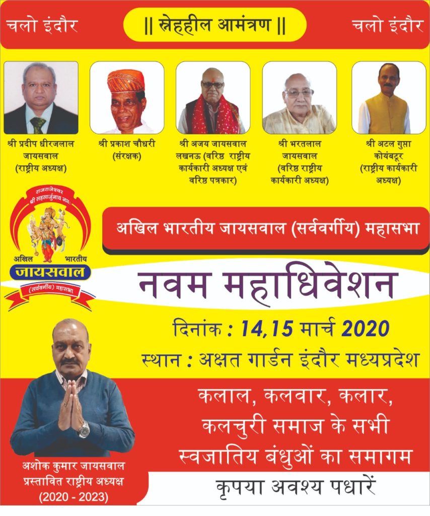 अखिल भारतीय जायसवाल (सर्ववर्गीय ) महासभा का नवम महाधिवेसन इंदौर 14 march – 15 march 2020 में सामिल होने के लिए आप सभी तो महासभा ने आमंत्रित किया है |