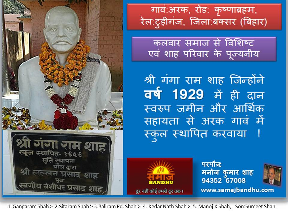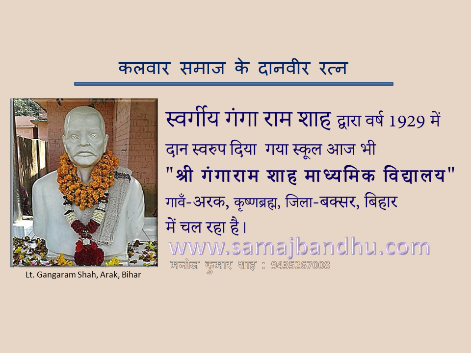 कलवार समाज के दानवीर रत्न स्वर्गीय गंगा राम शाह